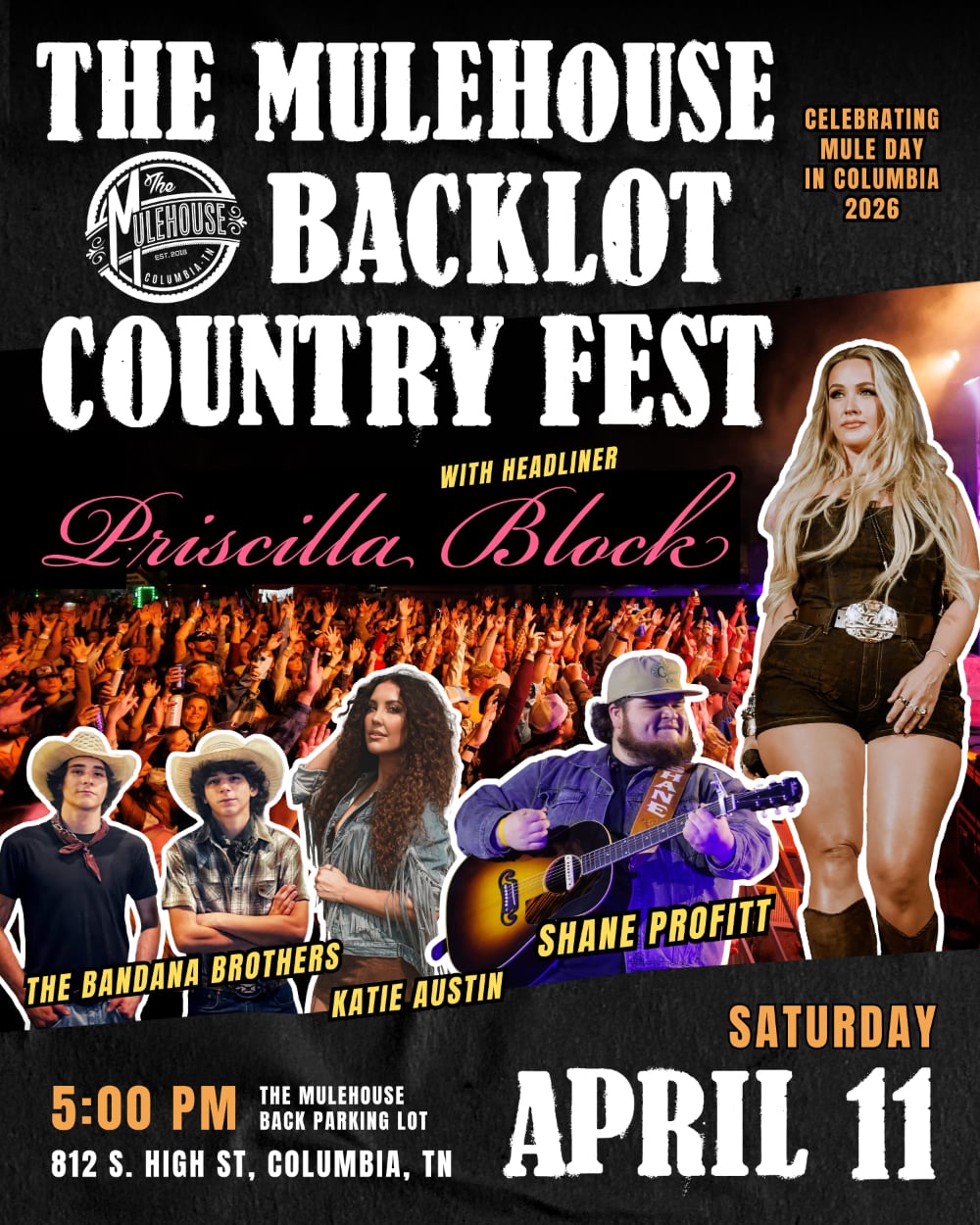 FEATURING PRISCILLA BLOCK, SHANE PROFITT, KATIE AUSTIN & THE BANDANA BROTHERS! Join us during Columbia’s annual Mule Day celebration for an unforgettable evening filled with an even more unforgettable concert from artists you love! This is your chance to be part of one of the most exciting events of the year, bringing the Mule Day energy straight into the heart of the city after the daytime festivities.